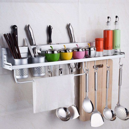 Description প্রোডাক্টের বিবরণ Main Rack: 58 x 12.5 x 10.5cm / 22.8 x 4.9 x 4.1” (L x W x H) Material: Space Aluminum + Plastic, Surface: Matte Finishing Shelf for storing cups, tableware, spices, condiments, cans and jars 10 Hooks for hanging cook utensils like pots, pans, and dish towels 4 Knife slots for storing knifes, such as kitchen knife and fruit knife